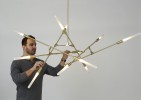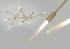 Inspired by intricacies of delicate jewelry, the Dawn chandelier is aesthetically pleasing from every angle and vantage point. Organic feel and sporadic in nature, the fixture gleams with a hand-polished finish while the custom hand-blown glass tubes provide perfect soft illumination. This modular system allows the chandelier to articulate and be configured in countless positions, both in horizontal or vertical orientations that suit the spacial needs.