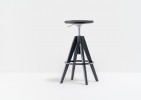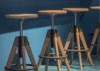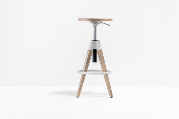 Arki-Stool joins Arki collection which reviews the industrial look in a functional way. A barstool with bleached or black stained solid oak seat and legs, swivel and with gas lift device to easily changes the height from 650 to 755mm. A steel footrest on the legs creates a nice contrast to the naturalness of the wood.