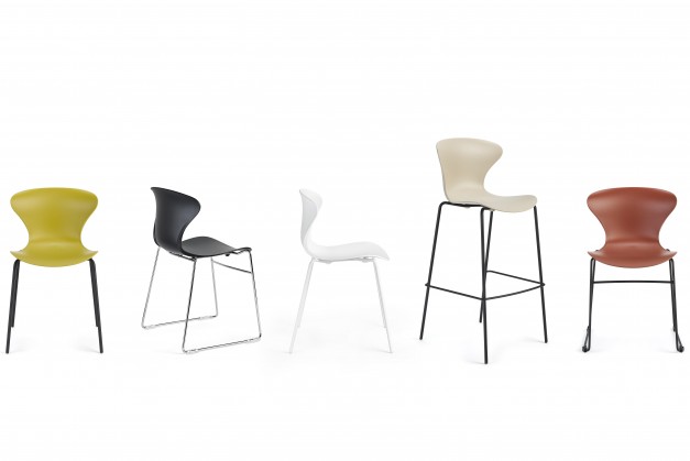 The dynamic expressive line of the robust polypropylene shell is enhanced to perfection by the great range of colours: Coal black, marsala, white, sand and curry. The frame is available in white, black and chrome, and the family comprises of 4 different versions: 4-leg, sled, 4-leg stool and sled stool.
