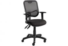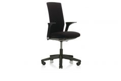 Seat and back fully upholstered in black house fabric with a three lever mechanism and gas lift on a nylon five star base with castors and arms.