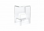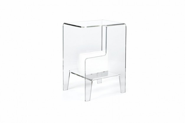 Multipurpose piece of furniture, small table and/or magazine rack and/or bedside table. Squared shape. Structure of methacrylate. Dividing element in white or black lacquered wood.