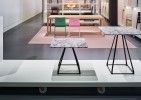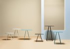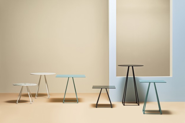 The base consists of four trapezoidal steel rods and can be combined with tops of different sizes and finishes.