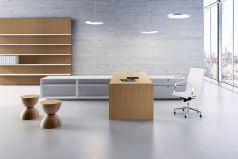 Executive Office System Leather. The warmth of leather, in classic, natural or modern shades. The striking look of the 7 cm tops, with 45° edge. Two unmistakeable stylistic features, in a unique combination of good looks and functionality. Cabinets, in black and white, complement the range with the same edge. Veneer. The warmth and natural beauty of wood envelop the Multipliceo desks to create new sensory emotions and aesthetic values, while maintaining all the simplicity and versatility of this range. Light Oak or Walnut veneer completely covers the 5 cm thick tops, giving a perfect hand-crafted finish.